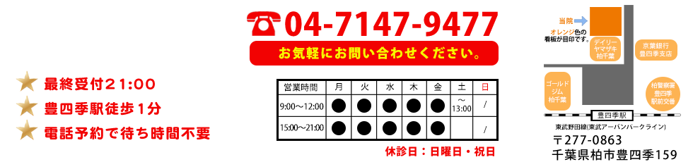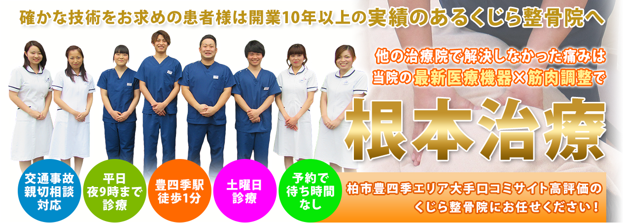 平日夜9時まで診療を行っておりますので、仕事が忙しい会社勤務の方も、部活が忙しい学生の方も、時間を気にする事無く治療が可能です。柏市や豊四季のエリアでも平日夜9時まで診療している整骨院や整体院は数少ないかと思います。患者様に安心して通院できるよう徹底して医療環境も見直していきます。