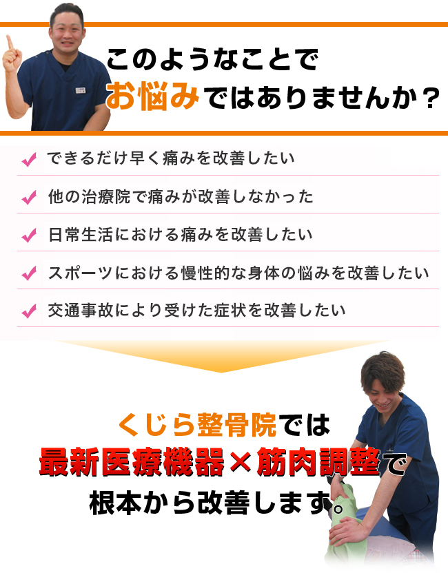 腰痛やぎっくり腰、肩こり、スポーツ障害や交通事故治療など幅広い症例に対しても国家資格を有した治療家が施術を担当させて頂きますのでお気軽に当整骨院にお問合せ下さいませ。